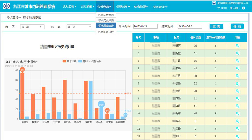 3)查詢站點(diǎn)數(shù)據(jù)信息,水位、雨量上報(bào)數(shù)據(jù),查看預(yù)警信息,可按條件篩選方式進(jìn)行查詢水位雨量數(shù)據(jù)值并分析,并且導(dǎo)出數(shù)據(jù),從而可以對(duì)數(shù)據(jù)匯總、分析、數(shù)據(jù)可存檔。